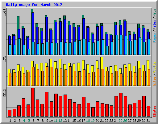 | Day | Hits | Files | Pages | Visits | Sites | KBytes | ||||||